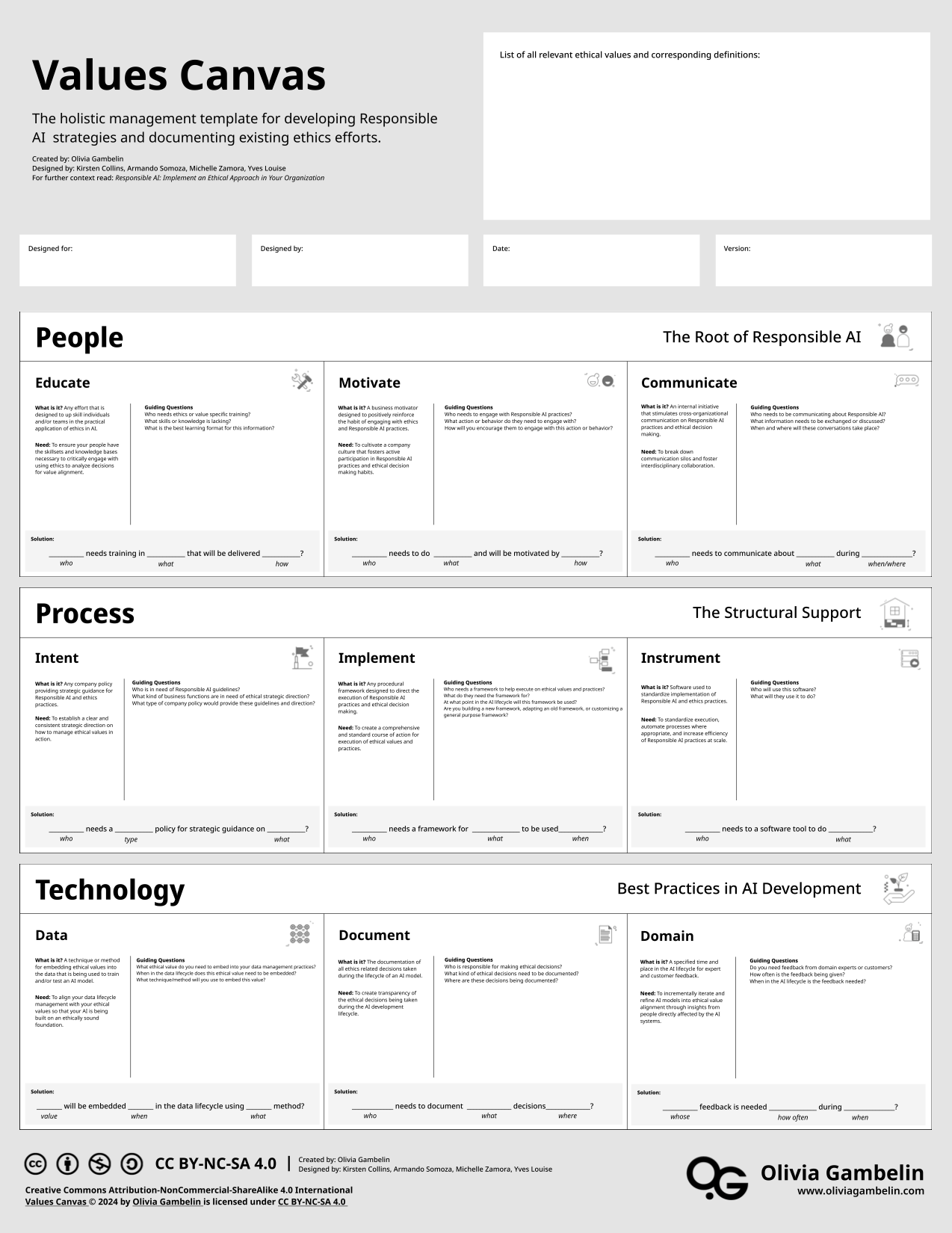 The Values Canvas is a strategic tool that helps enterprise teams embed ethics into AI development and deployment. We developed the concept, design, and launch of the tool, which is published in Responsible AI: How to Implement an Ethical Approach in Your Organization. Today, the Values Canvas is used by organizations to align people, process, and technology around Responsible AI strategy.