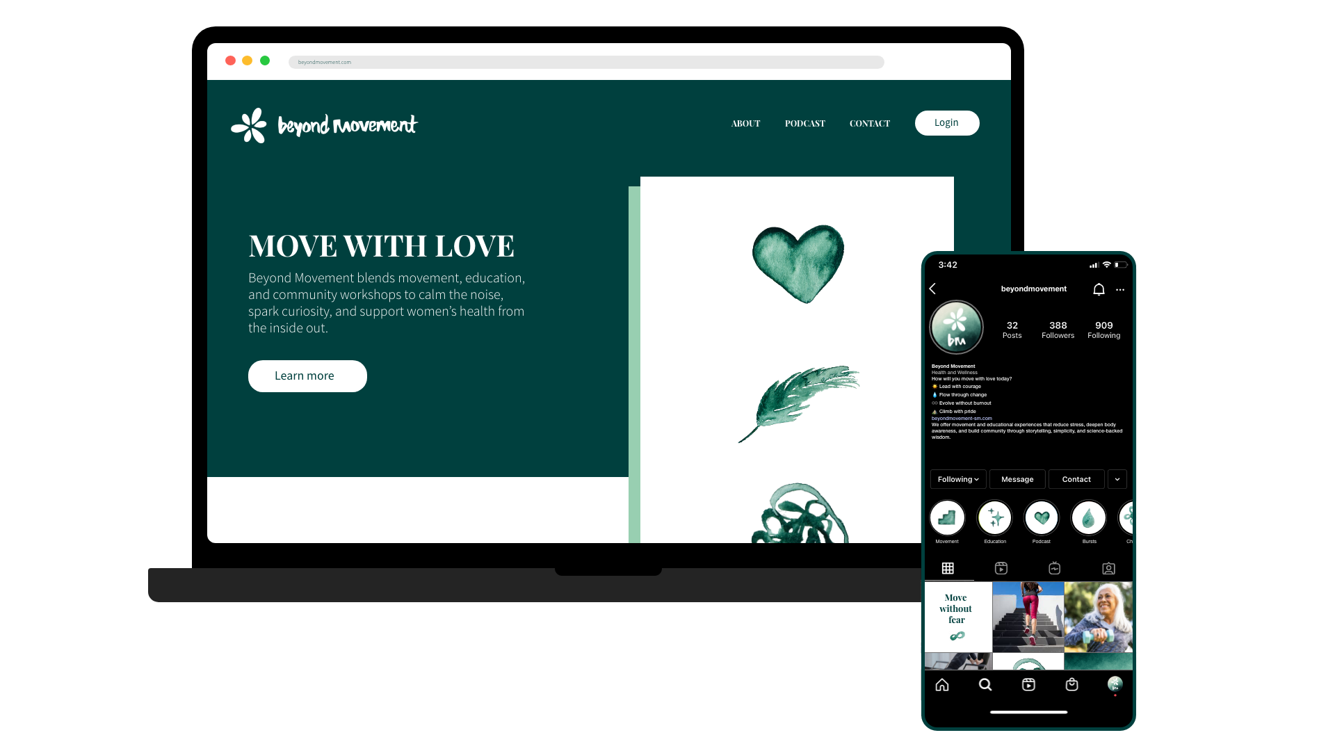 Beyond Movement is a women’s health and movement brand rooted in softness, rhythm, and self-awareness. We partnered with Somayeh to design a brand identity system and website that provide a strong foundation for her business which offers educational content and community workshops that spark curiosity and help every body come home to itself.