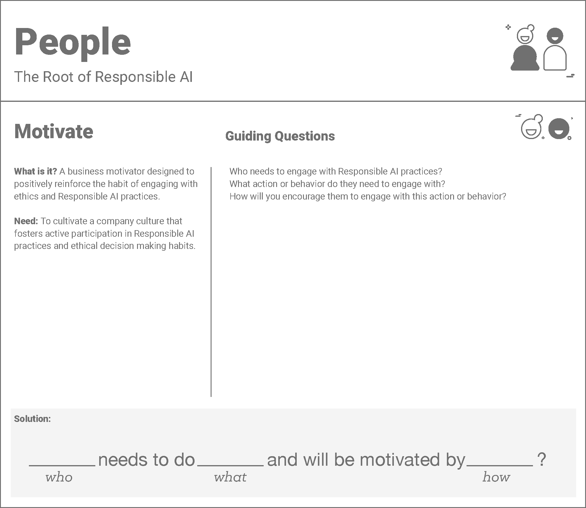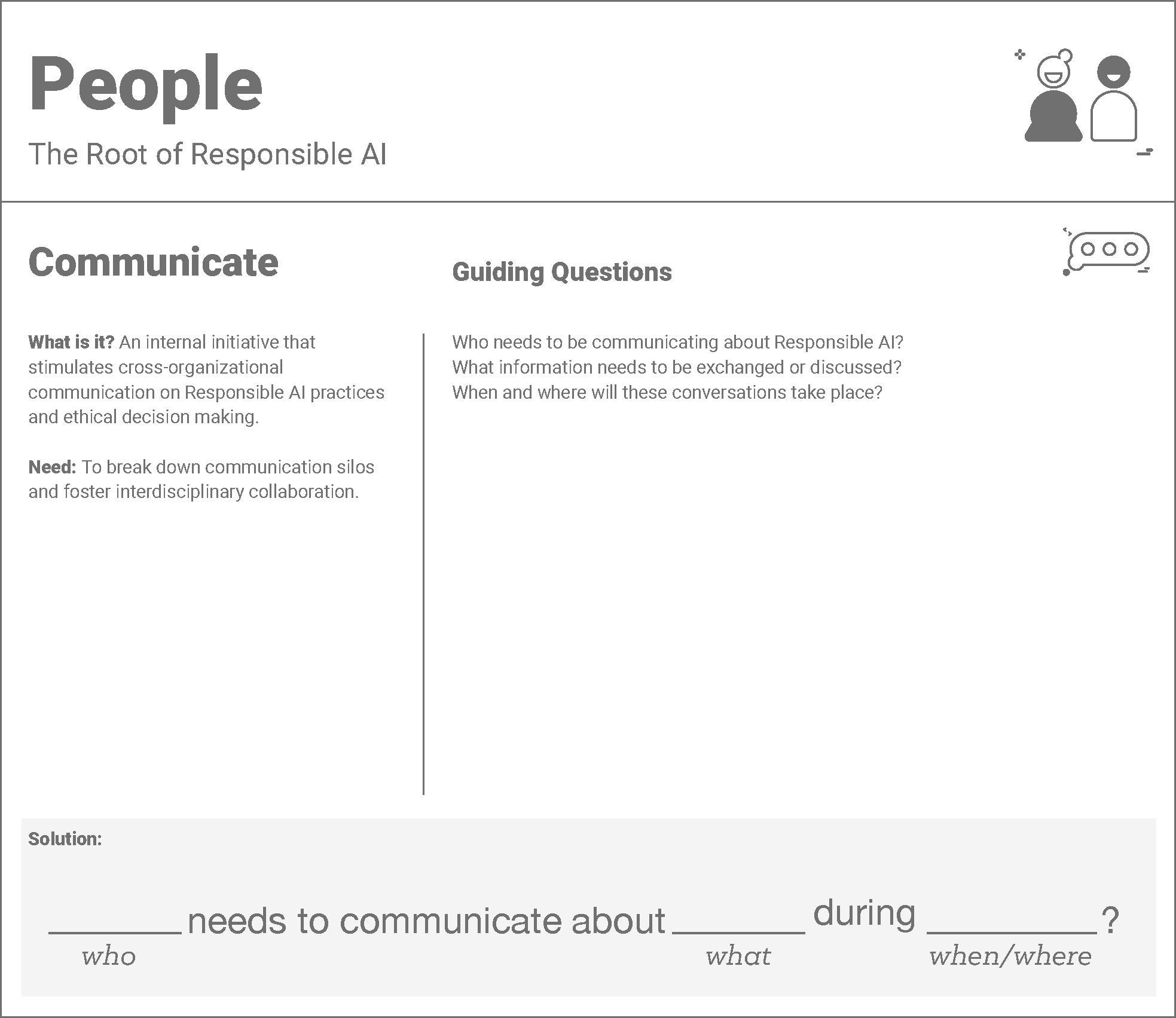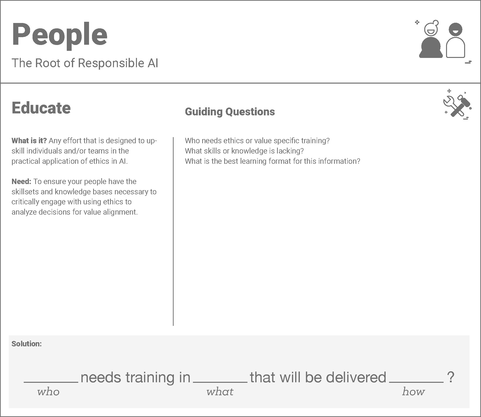 The work focused on translating complex Responsible AI concepts into a usable, systems-driven tool that enables cross-functional teams to align on values, assess risk, and operationalize governance across People, Process, and Technology.